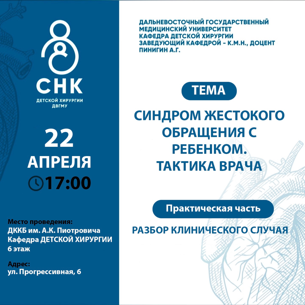 22 апреля в 17:00 состоится заседание кружка на кафедре детской хирурги в ДККБ им. Пиотровича по адресу ул. Прогрессивная 6.