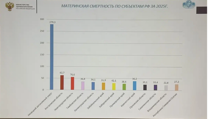 К большому сожалению, из 13 территорий РФ, имеющих самые высокие (худшие) показатели по материнской смертности, 5 территорий (Забайкальский край, Камчатский край, Приморский край, Хабаровский край, Сахалинская область) входят в состав Дальневосточного Федерального округа (ДВО). Если, в целом, по РФ показатель материнской смертности в 2025 г. был равен 9,5 (на 100000 живорожденных), то в Хабаровском крае этот показатель превышает аналогичный показатель по стране в 4,4 раза что безусловно требует повышение качества организационных мероприятий.